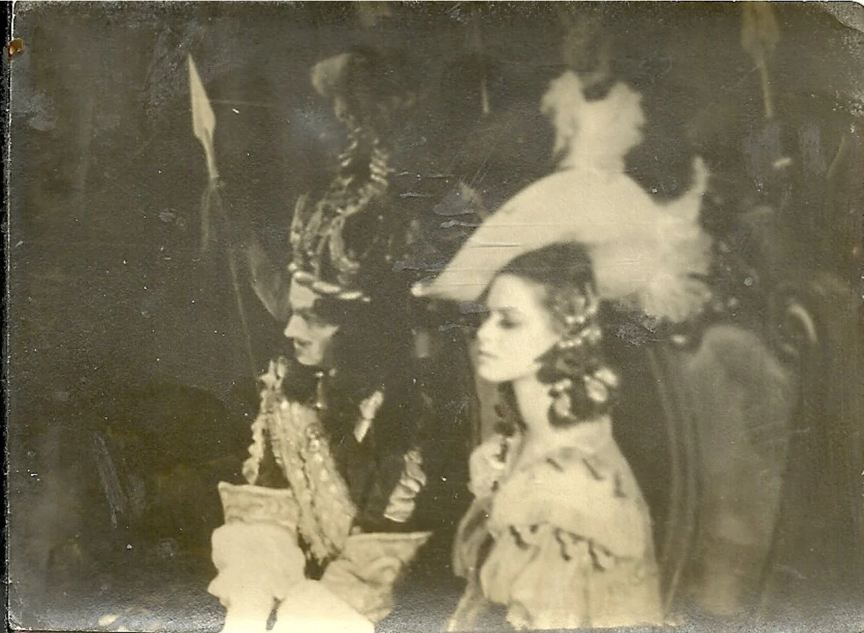 152. This photograph from the wings shows Margot Fonteyn as Aurora in the Wedding pas de deux of Act Three of The Sleeping Beauty with David Paltenghi as the Prince. This is the only photograph of the Fonteyn-Paltenghi partnership I know: he was more usually partner to Beryl Grey or other Auroras. A tall man, he had limited dance technique, but looked striking in the Prince’s Act Two pink/red hunting coat. Fans in the Covent Garden amphitheatre gave a sofa there his name because it was that colour: “Meet you on David Paltenghi in the interval”. He later became a choreographer for Ballet Rambert.