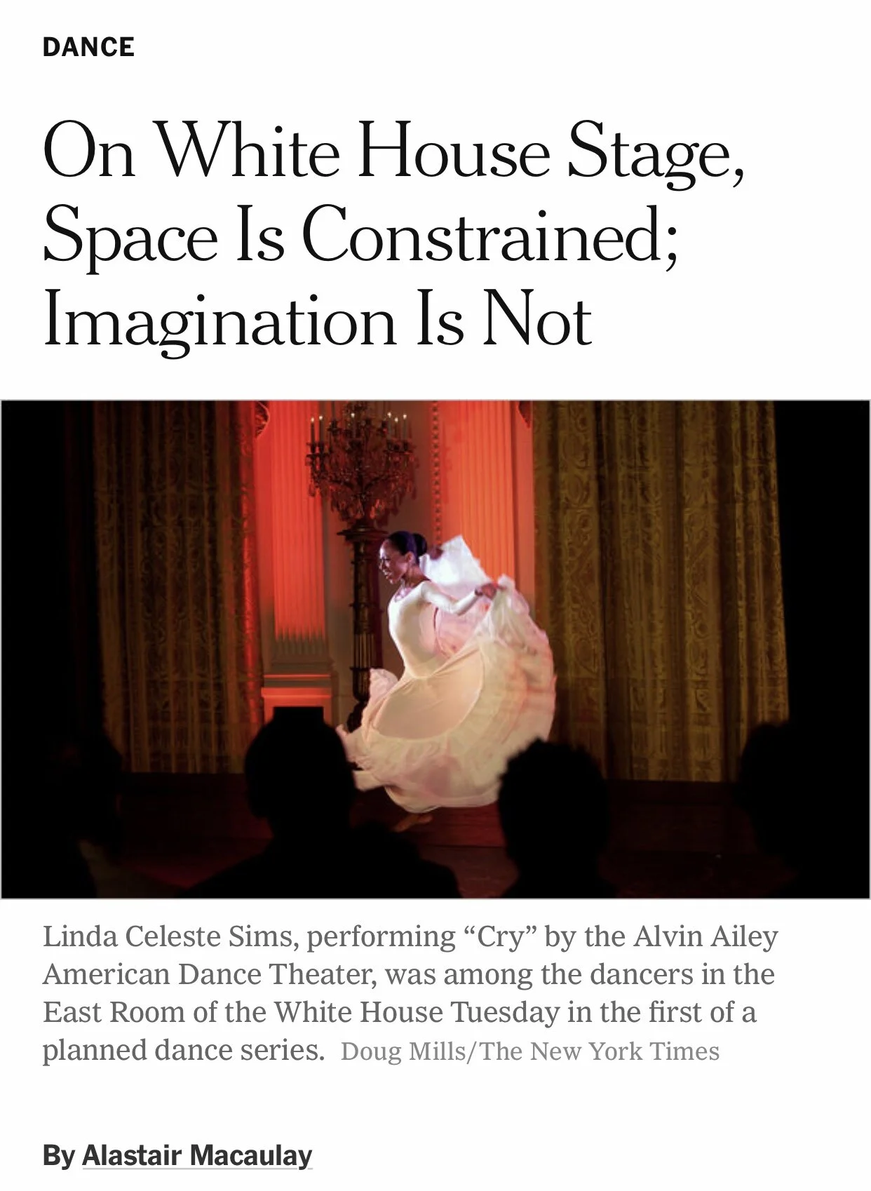 143: Linda Celeste Sims of the Alvin Ailey American Dance Theatre, performing Ailey‘s “Cry” at the East Room, White House, September 8, 2010. Photo: Doug Mills, “New York Times”.