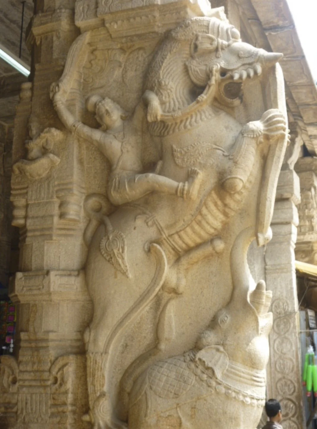 10: A single-stone pillar on the Sri Meenakshi-Sundereshwarar temple, Madurai, Tamil Nadu.