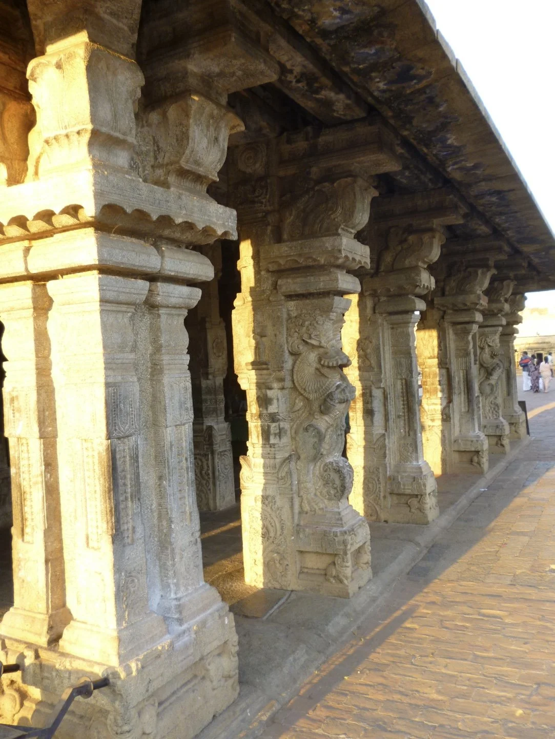 <4> shows just one row of the temple’s virtuoso single-stone pillars, this afternoon, at Kanchipuram’s EkambareshvaTemple.