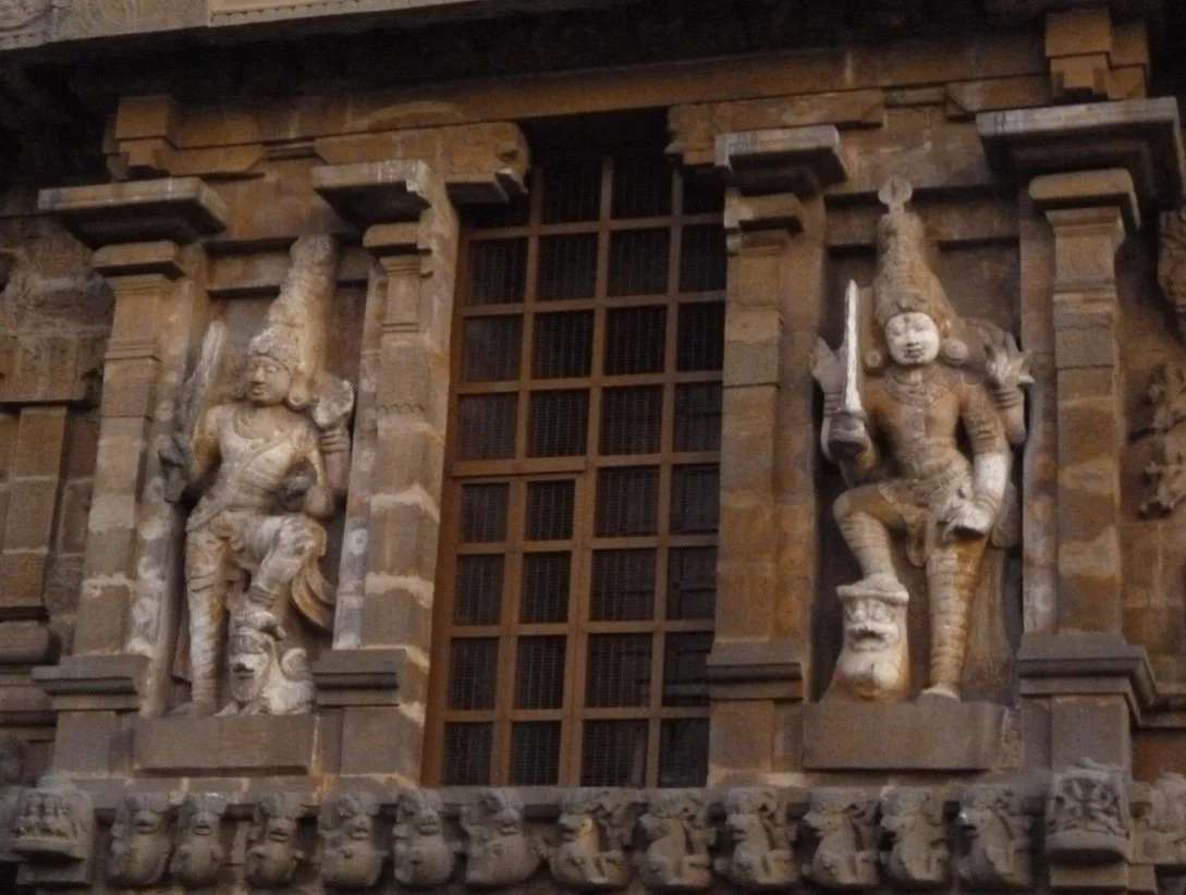 25: Sculpted pillars on either side of a window in the temple at Thanjavur.