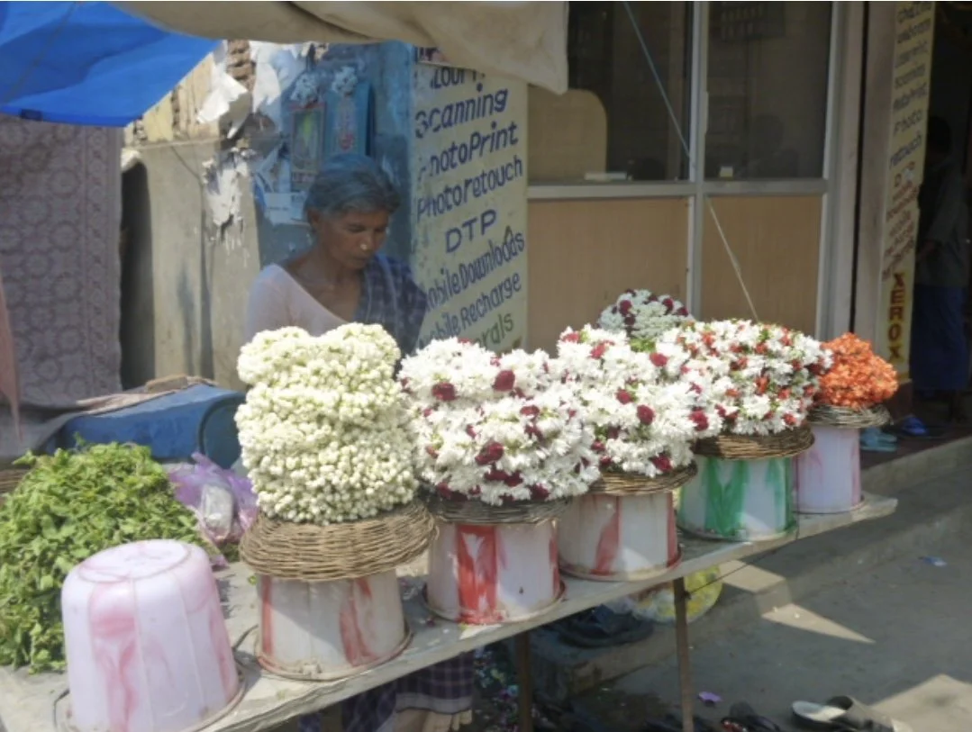 43: flowers for sale at the temple at Srirangam, Tamil Nadu