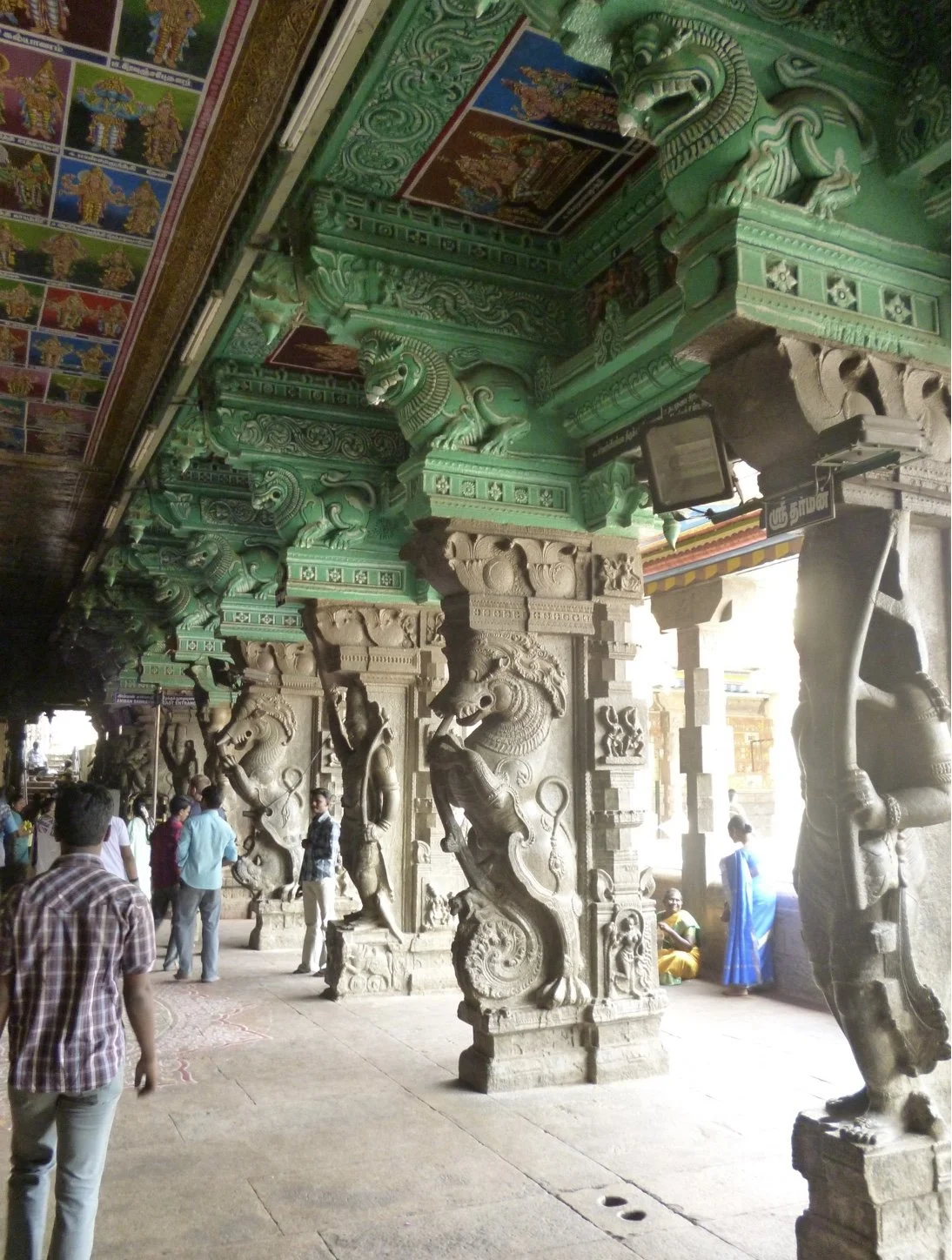 Unlike the temples I saw yesterday at Kunchipuram and many of the other temples I will see, it is painted in bright colours, especially on the ceilings and ornaments. It's also very much a working temple, with apparently fifty priests attached. While I and other tourists were moving around, people were abasing themselves on the floor in prayer, and there were several zones shut off to non-Hindus. Some of the primary-coloured painting is cartoon-like - Disney-cum-Bollywood - but this is offset by the astounding pillars, thousands of them each constructed from single blocks of stone, often making up multi-pillared halls that recall those in Egypt (Luxor, Karnak, etc.) and in the crypts of Romanesque cathedrals. The pillars aren't as vast as those in Egypt, but they are amazingly sculpted: some of the sculptures recall Egypt, a few Assyrian sculpture, and some really do recall the Romanesque. And the juxtapositions of coloured painting and august halls of pillars and vivid sculpting and intense worship makes for a very heady mix. <7, 8, 9, 10, 11, 12, 13>