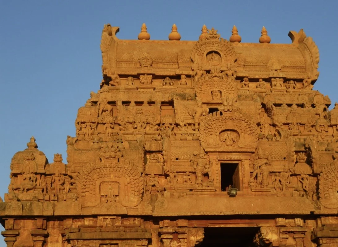 21: evening sunlight on a gopura at the temple at Thanjavur, Tamil Nadu.